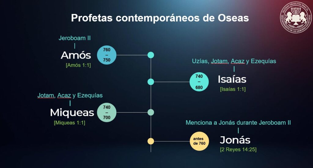 Oseas profetizó aproximadamente entre los años 755–715 a.C., lo que lo convierte en uno de los últimos profetas que Dios envió al reino del Norte antes de su caída en el 722 a.C. a manos de Asiria. Su ministerio inició en el reinado de Jeroboam II (rey poderoso pero idólatra), y continuó durante los reinados posteriores hasta poco antes de la destrucción del reino.