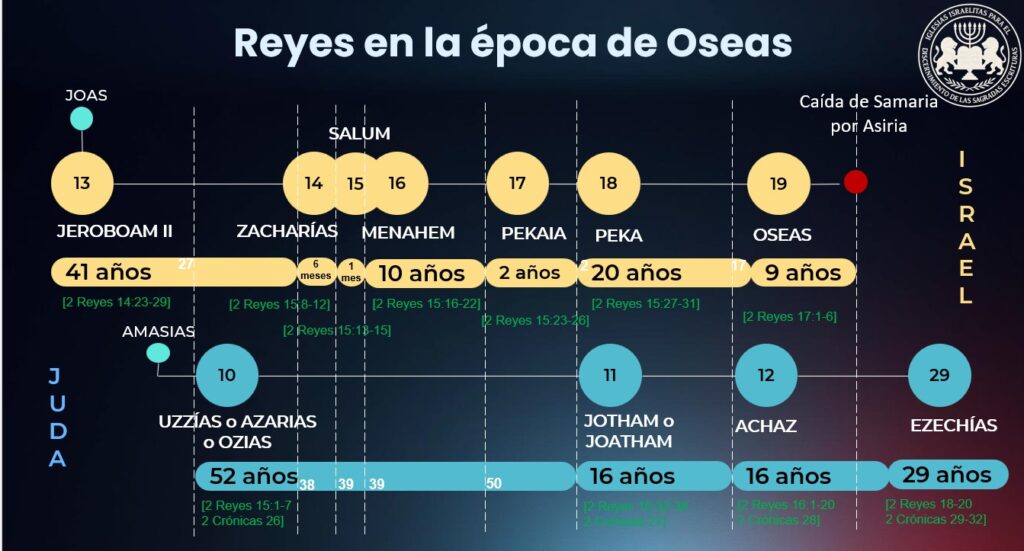 Con base en la história tenemos entendido que Oseas profetisa de 40 a 60 años aproximadamente, en los días de Uzzías, Jotham, Achaz y Ezechíaz reyes de Judá o reino del Sur, y de Jeroboam II rey de Israel o reino del Norte.
